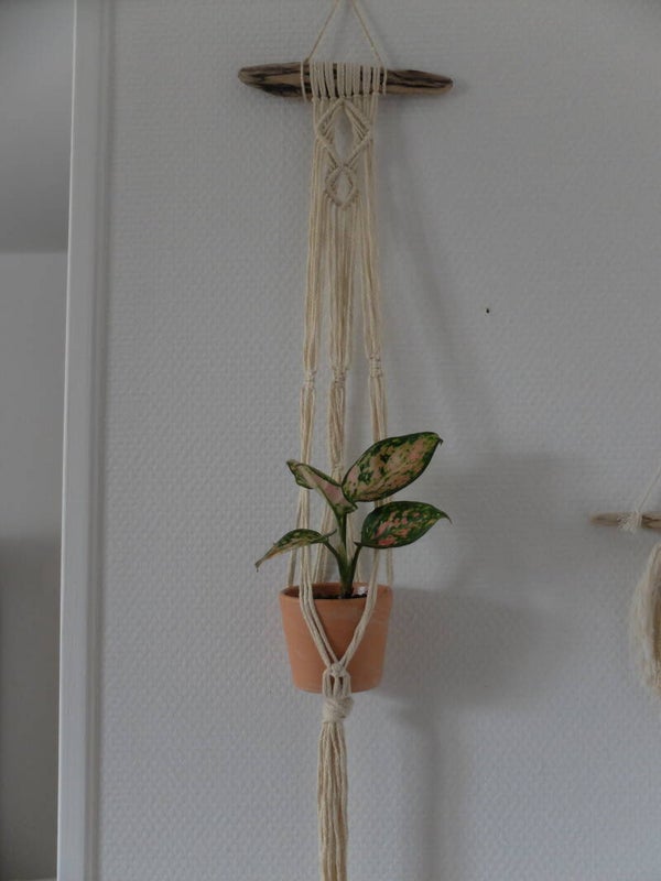 Il a été réalisé entièrement à la main avec de la corde de coton et du bois flotté.