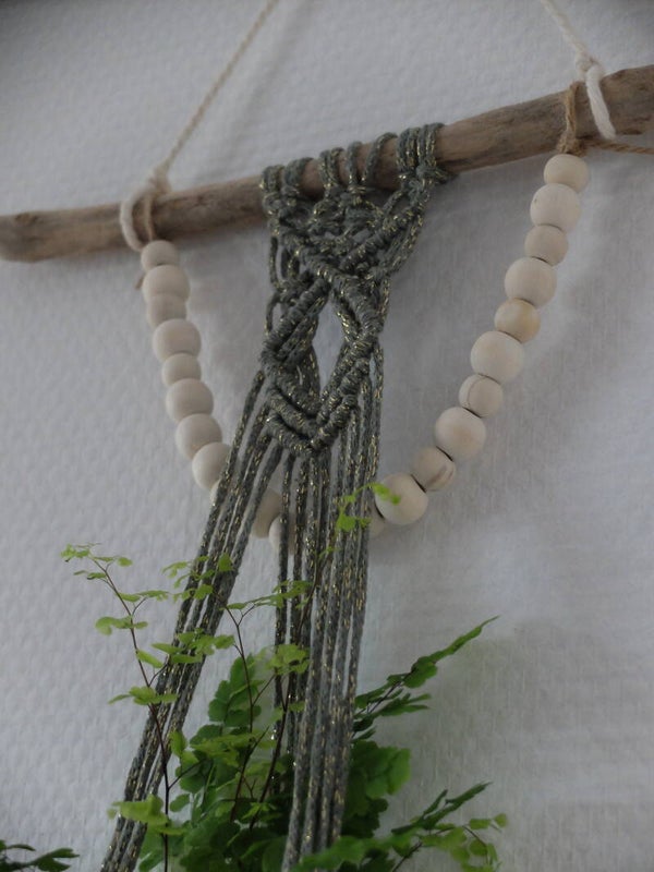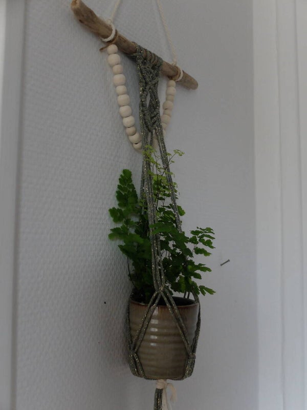 Découvrez ce porte plante mural en macramé et ornée d'un joli colier de perles en bois.